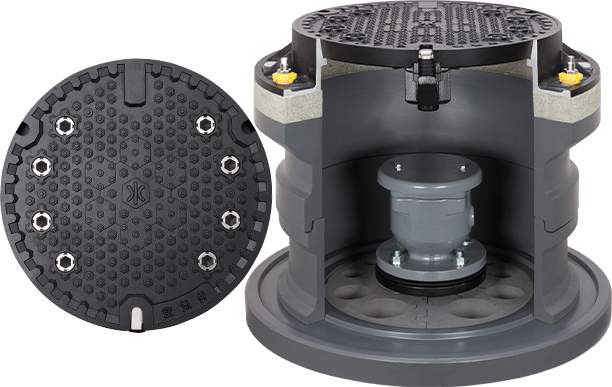災害時の重要な水源を守る耐震設計の鉄蓋。地震にも強い構造です。